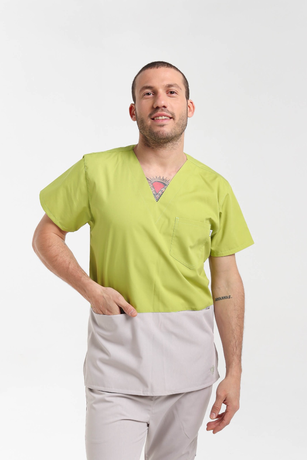 Chaquetilla clásica cuello en V ARCIEL con dos colores en frente y espalda. Tiene tres bolsillos, uno en el busto y dos disimulados en la franja inferior.