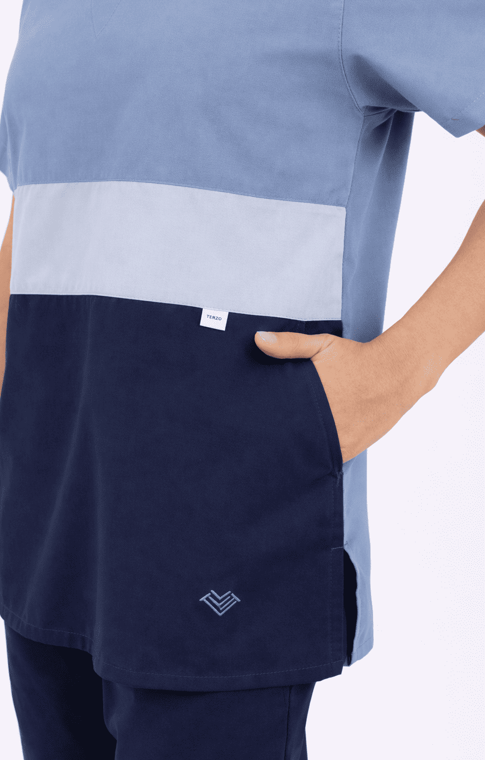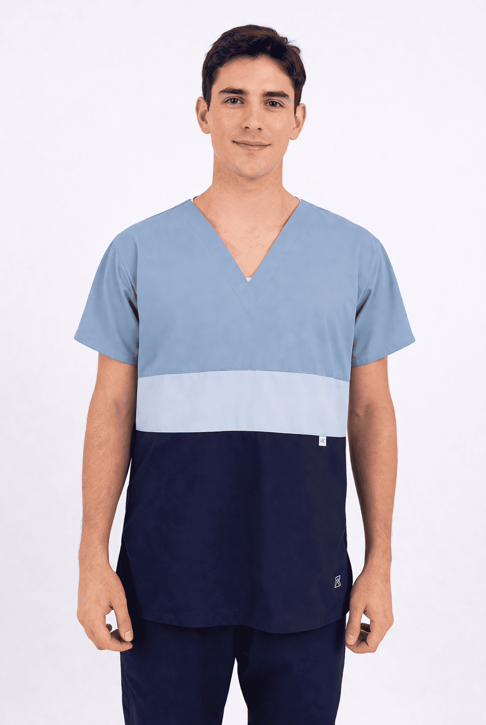 Chaqueta TRICOLOR con tela ARCIEL de alta calidad y ultra durable, cuello en V, combinado con tres colores de tendencia al frente y en la espalda un solo color liso. Tiene dos bolsillos diagonales amplios disimulados en la última franja con atraques a contratono de seguridad. Logo corazón bordado a contra tono y aberturas laterales para mayor flexibilidad y apertura en cadera.
