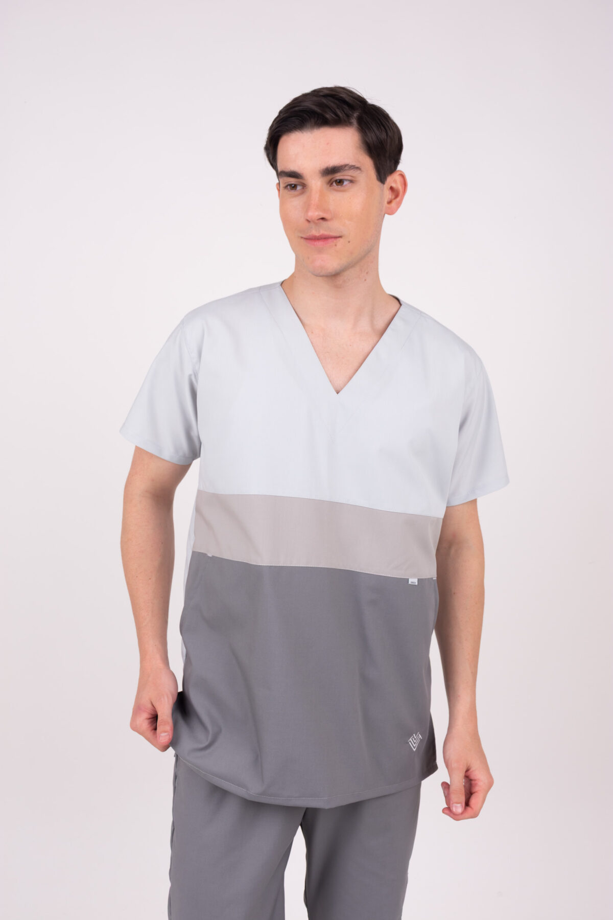 Chaqueta TRICOLOR con tela ARCIEL de alta calidad y ultra durable, cuello en V, combinado con tres colores de tendencia al frente y en la espalda un solo color liso. Tiene dos bolsillos diagonales amplios disimulados en la última franja con atraques a contratono de seguridad. Logo corazón bordado a contra tono y aberturas laterales para mayor flexibilidad y apertura en cadera.