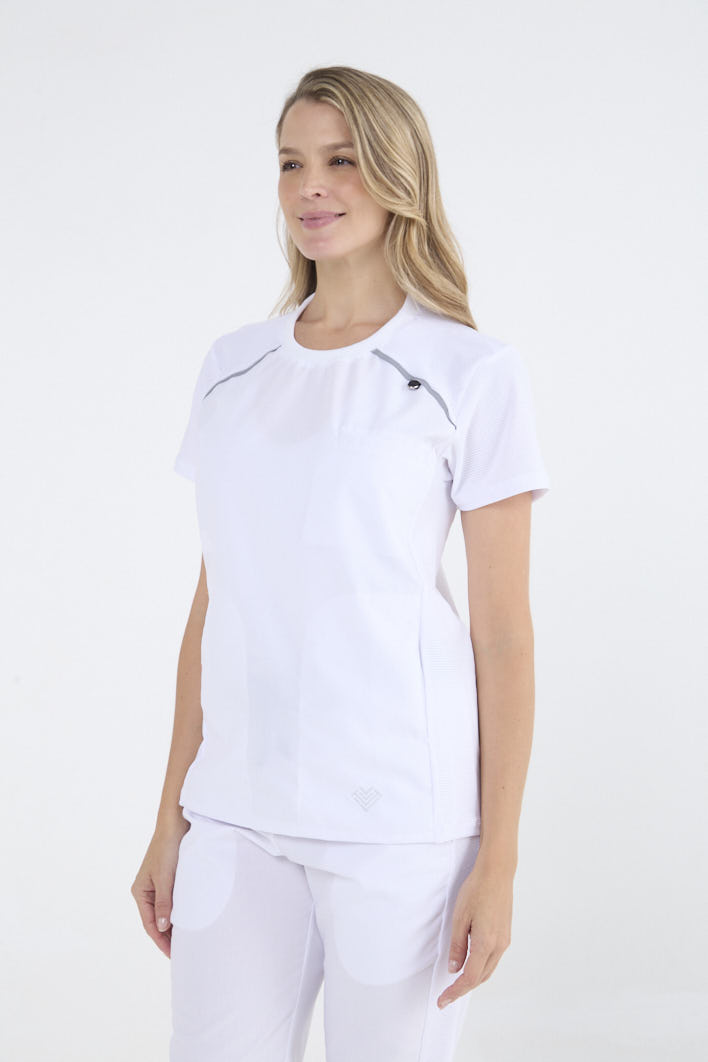 Chaquetilla COMFY Grafil (Blanco) / Arciel (Negro) cuello redondo de Rib de algodón, con cordón porta credencial en hombro y dos bolsillos inferiores amplios. Sus recortes spandex con tecnología Dry fit permiten mejor absorción, secado rápido de la transpiración, respiración de la piel y otorga mayor flexibilidad en los movimientos. Con detalle reflectivo en el color blanco en espalda y en el color negro en delantero.