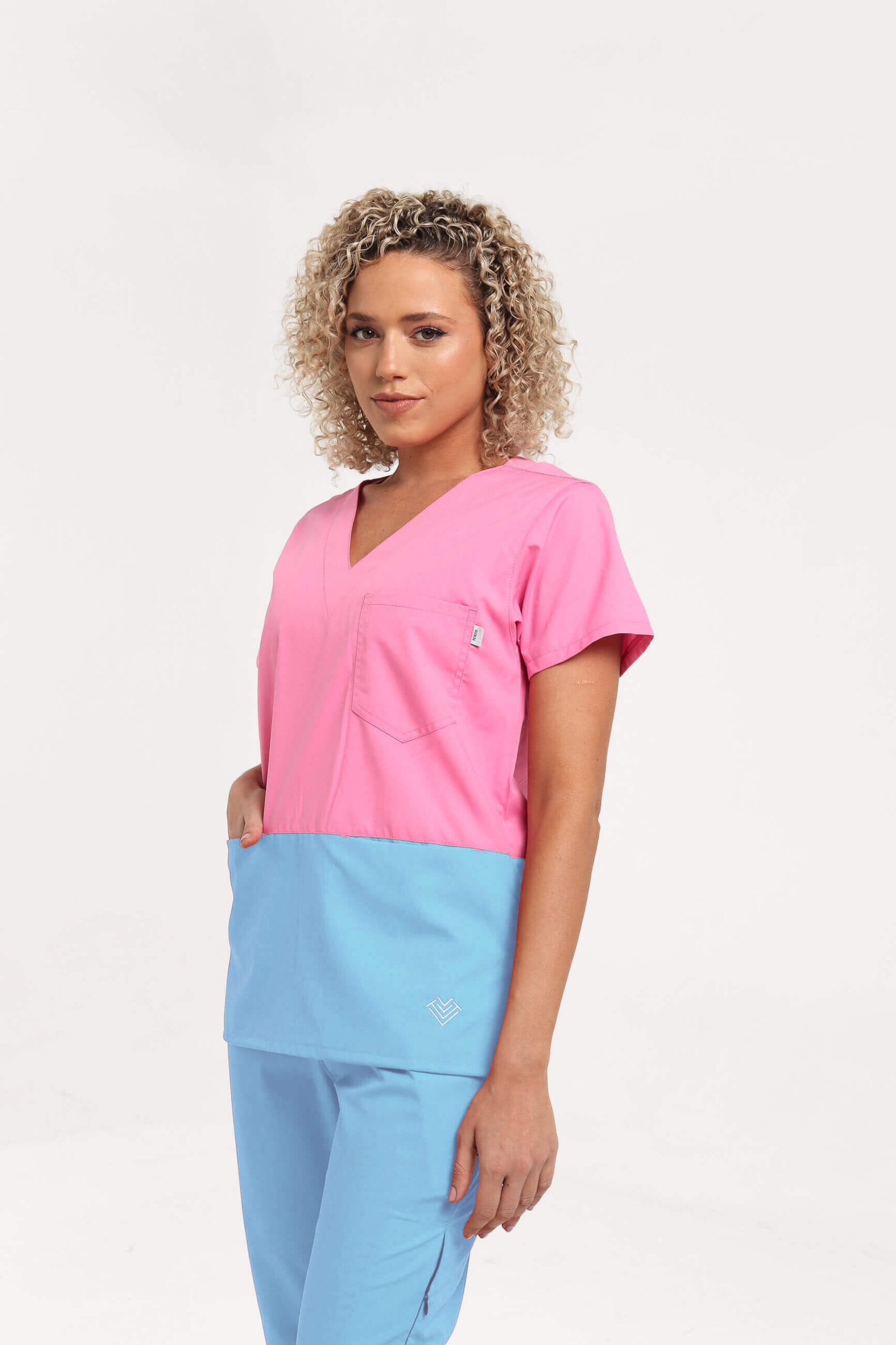 Chaquetilla clásica cuello en V ARCIEL con dos colores en frente y espalda. Tiene tres bolsillos, uno en el busto y dos disimulados en la franja inferior.