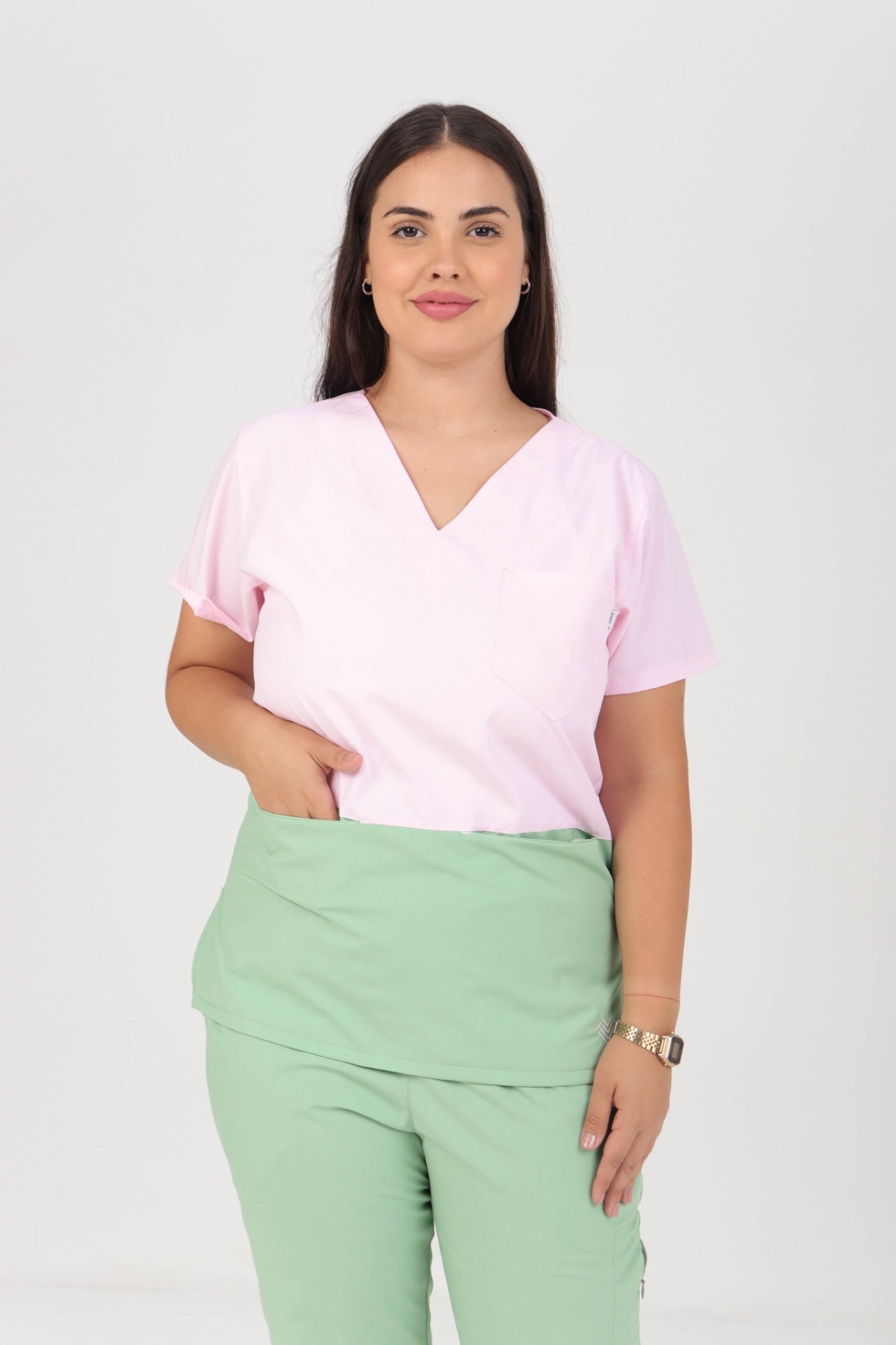 Chaquetilla clásica cuello en V ARCIEL con dos colores en frente y espalda. Tiene tres bolsillos, uno en el busto y dos disimulados en la franja inferior.