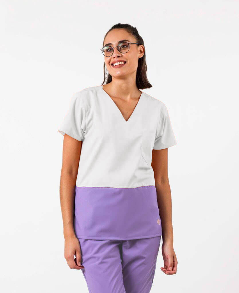 Chaquetilla clásica cuello en V ARCIEL con dos colores en frente y espalda. Tiene tres bolsillos, uno en el busto y dos disimulados en la franja inferior.