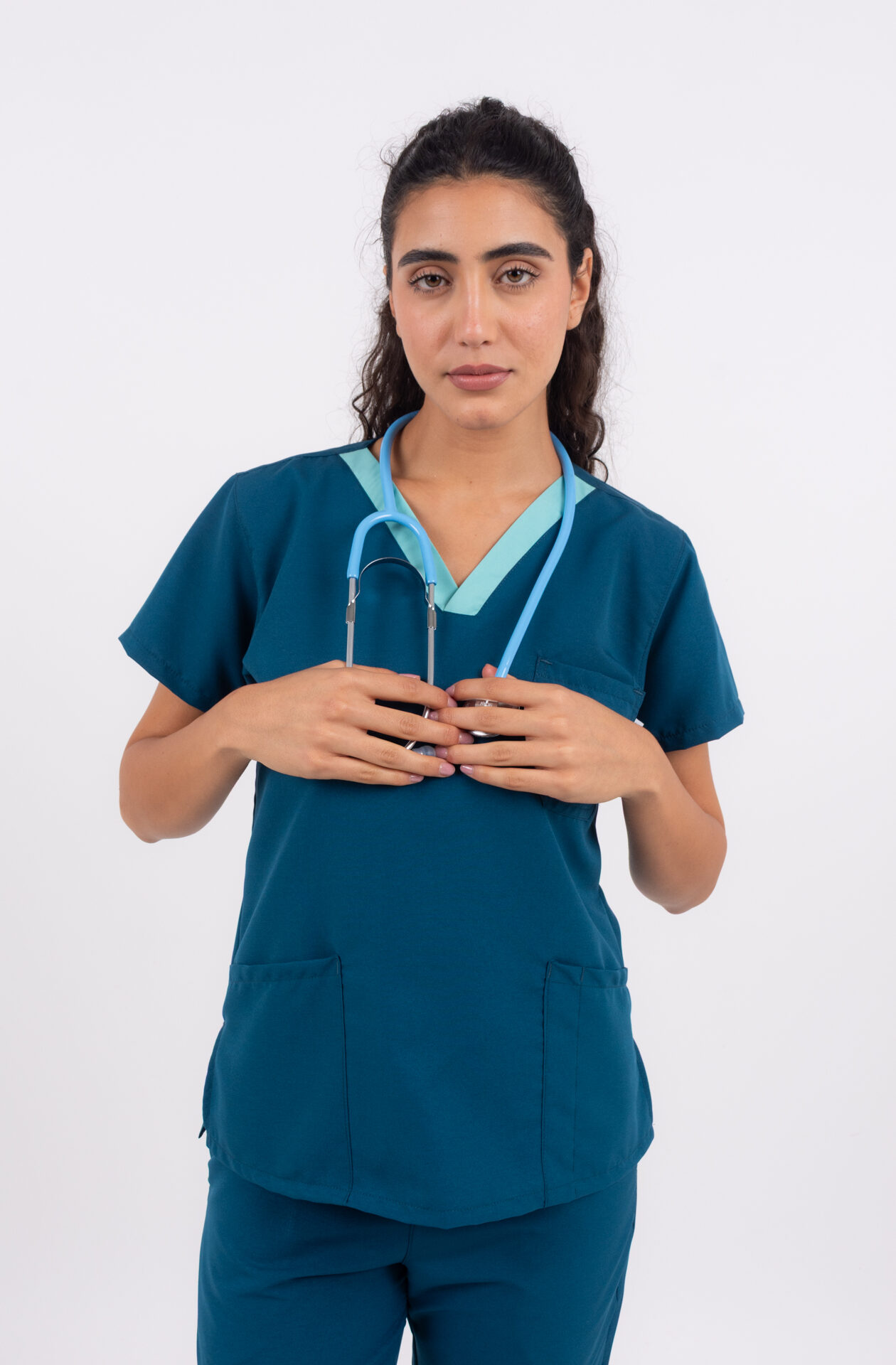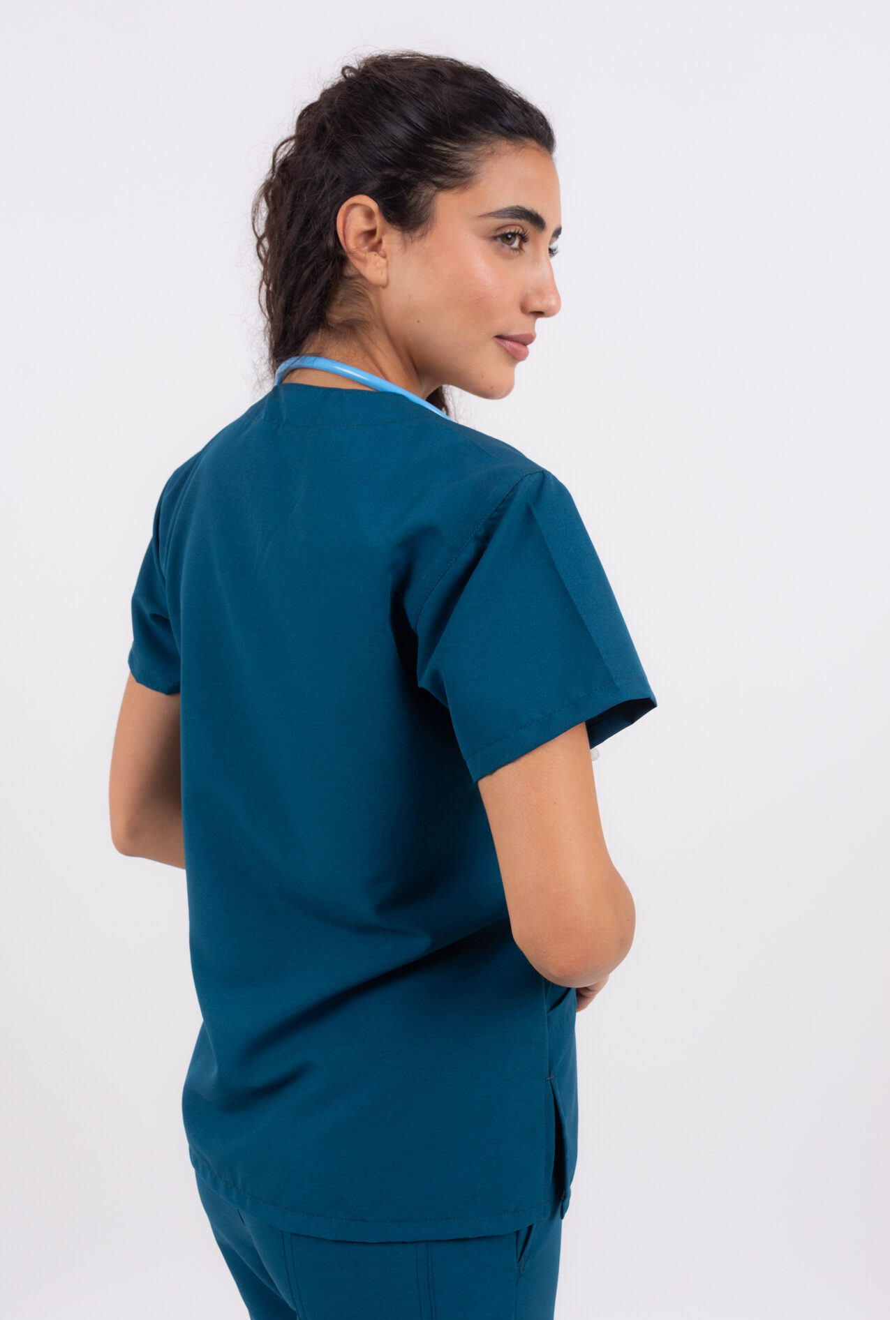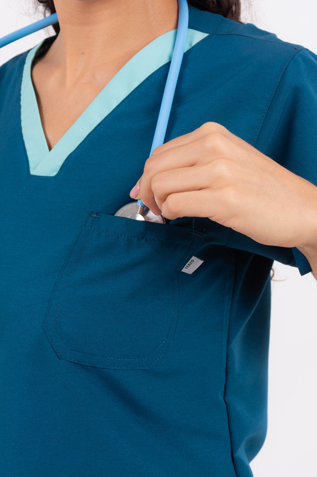 Chaqueta confeccionada en tela técnica liviana, de corte CLÁSICO con calce cómodo y relajado que brinda libertad de movimiento durante toda la jornada, escote en V con tira de cuello a contratono que aporta un detalle distintivo, contiene un bolsillo superior estilo plaque y dos bolsillos amplios inferiores con corte diagonal. Presenta mangas cortas de caída recta y terminaciones prolijas, con una silueta limpia y profesional. También cuenta con abertura en los laterales tipo tajo para mejorar la amplitud en la cadera. Incorpora atraques (costuras de refuerzo) en todas las zonas críticas de la prenda, aportando mayor resistencia y durabilidad en el uso diario.