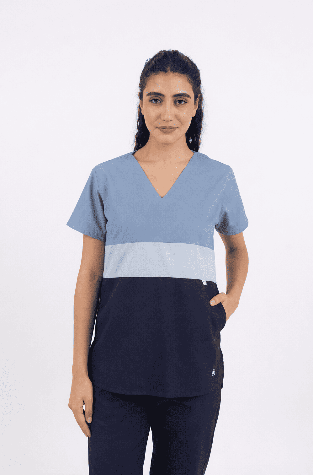 Chaqueta TRICOLOR con tela ARCIEL de alta calidad y ultra durable, cuello en V, combinado con tres colores de tendencia al frente y en la espalda un solo color liso. Tiene dos bolsillos diagonales amplios disimulados en la última franja con atraques a contratono de seguridad. Logo corazón bordado a contra tono y aberturas laterales para mayor flexibilidad y apertura en cadera.