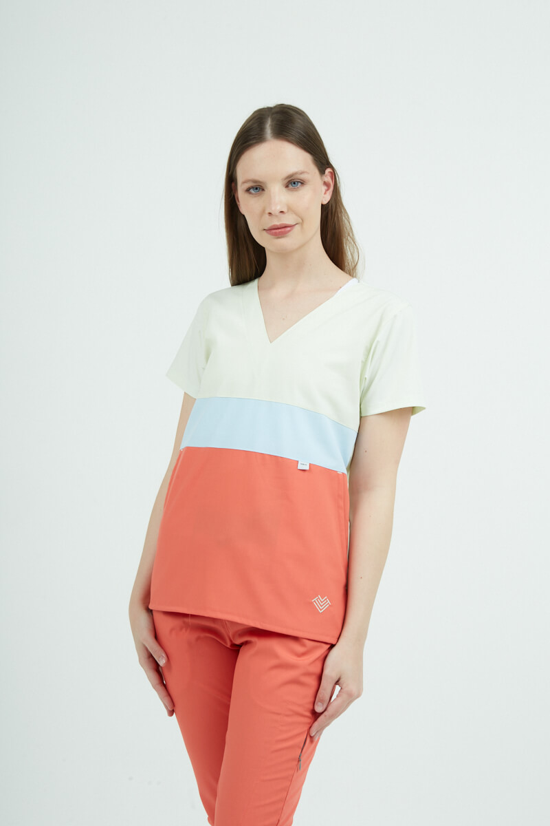 Chaqueta TRICOLOR con tela ARCIEL de alta calidad y ultra durable, cuello en V, combinado con tres colores de tendencia al frente y en la espalda un solo color liso. Tiene dos bolsillos diagonales amplios disimulados en la última franja con atraques a contratono de seguridad. Logo corazón bordado a contratono y aberturas laterales para mayor flexibilidad y apertura en cadera.