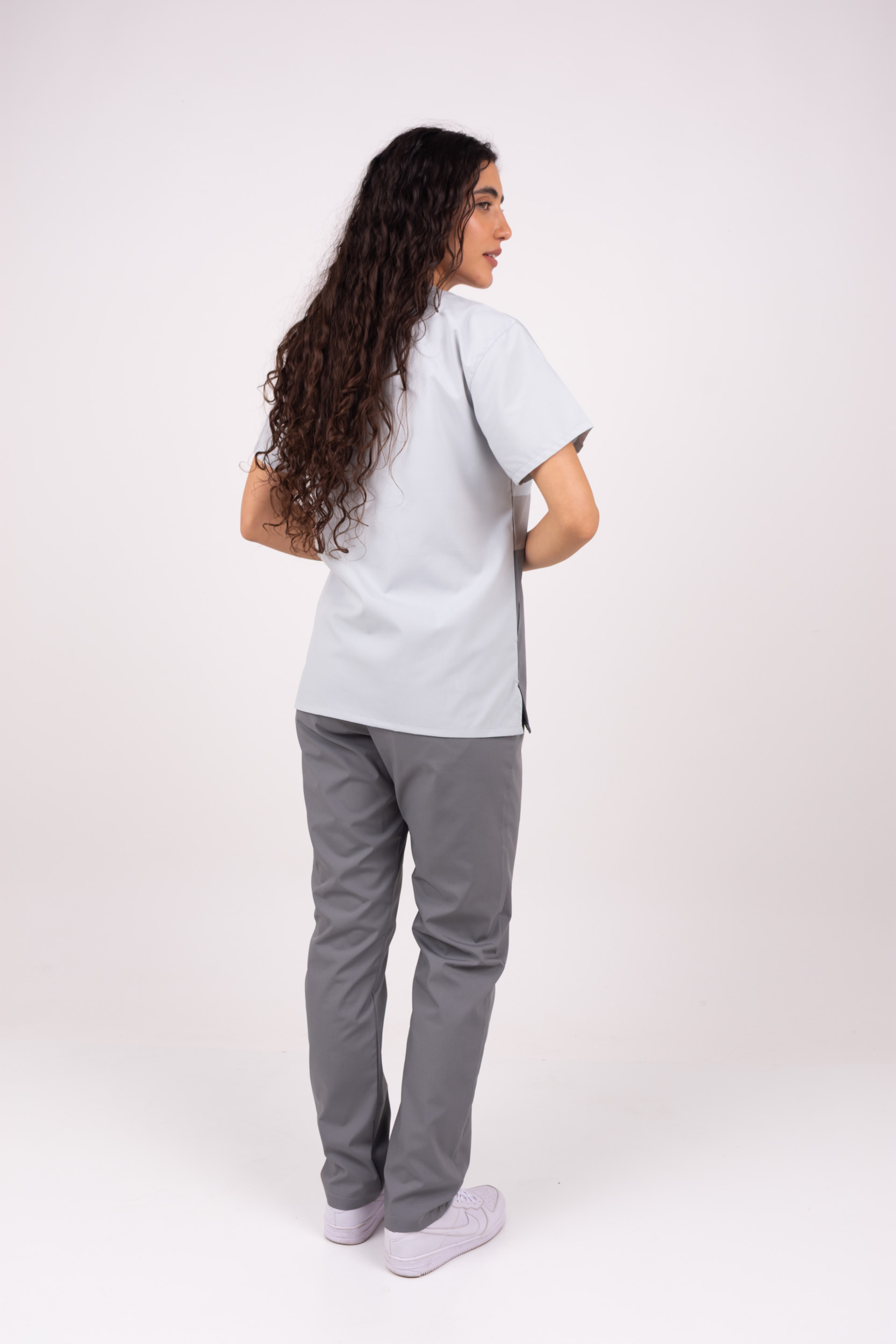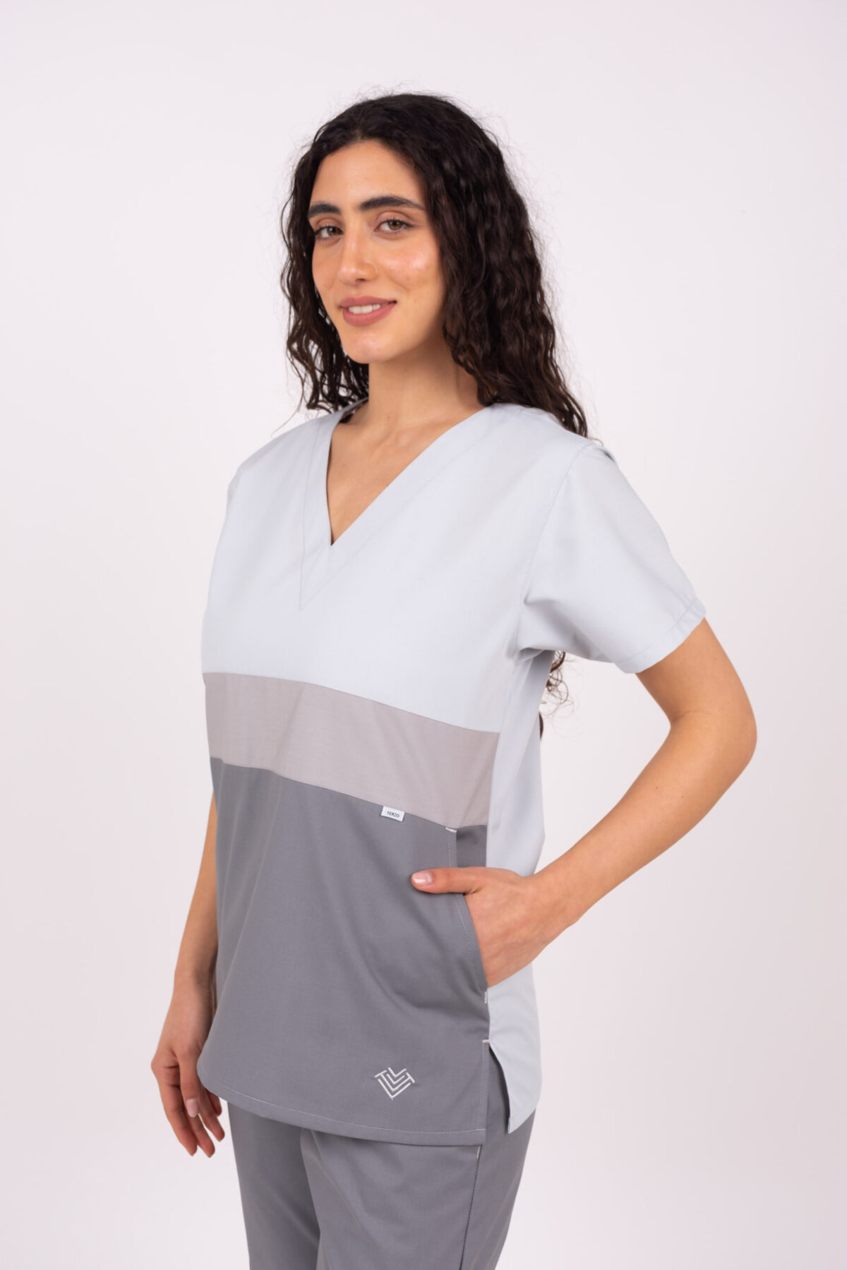 Chaqueta TRICOLOR con tela ARCIEL de alta calidad y ultra durable, cuello en V, combinado con tres colores de tendencia al frente y en la espalda un solo color liso. Tiene dos bolsillos diagonales amplios disimulados en la última franja con atraques a contratono de seguridad. Logo corazón bordado a contra tono y aberturas laterales para mayor flexibilidad y apertura en cadera.